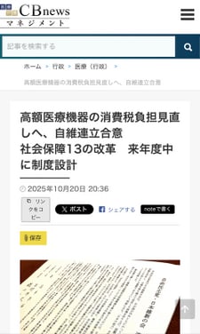 1. 医療介護CBnews「高額医療機器の消費税負担見直しへ、自維連立合意 社会保障13の改革 来年度中に制度設計」2025年10月20日